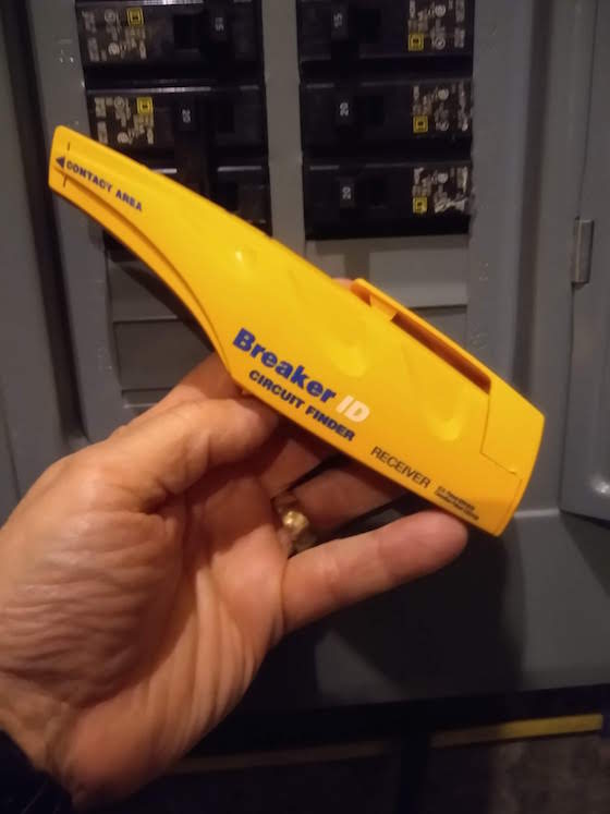 Here I am scanning the breakers. You need to calibrate the tool by running it up and down all the breakers in the panel. It only takes seconds to do. CLICK or TAP HERE to preserve your sanity and voice. Once you scan all the breakers you do it one more time. When the tip of the scanner is on top of the breaker that powers the outlet that the transmitter is plugged into, the green LED lights up brighter than your eyes when you get a prize from your best friend!
